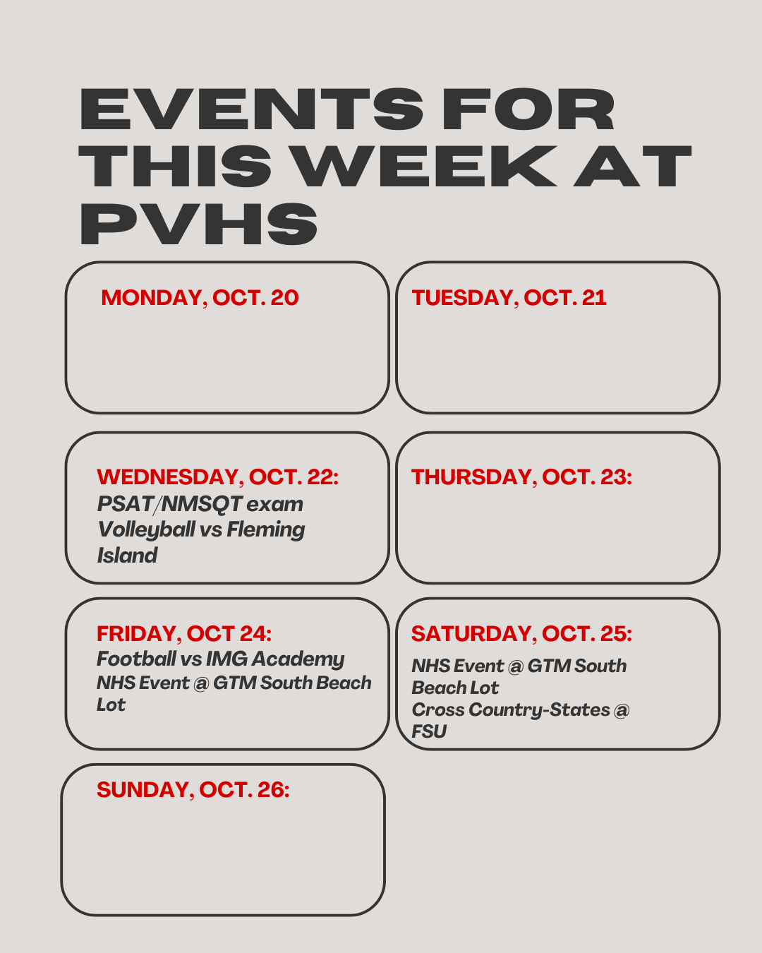 HomepageUncategorizedEvents for Week of 10/20 at Ponte Vedra High School Uncategorized Events for Week of 10/20 at Ponte Vedra High School Posted on October 21, 2025 Tagged:eventspvhssharkssports LEAVE A RESPONSE Cancel replyYour email address will not be published. Required fields are marked *Comment * Name * Email * Website Save my name, email, and website in this browser for the next time I comment. Δ Post navigation Previous PostPVHS Boys Golf Start Slow, Hoping to Bounce Back Strong You Might Also Like Uncategorized Boys and Girls Track and Field is Officially Underway PVHS Tiburon April 8, 2025 Feature PVHS MUN Places Strong at GatorMUN PVHS Tiburon February 6, 2024 Uncategorized This Week in History 9/28- 10/4 PVHS Tiburon October 2, 2020 Feature The Impact of Energy Drinks on Teenagers PVHS Tiburon September 23, 2025