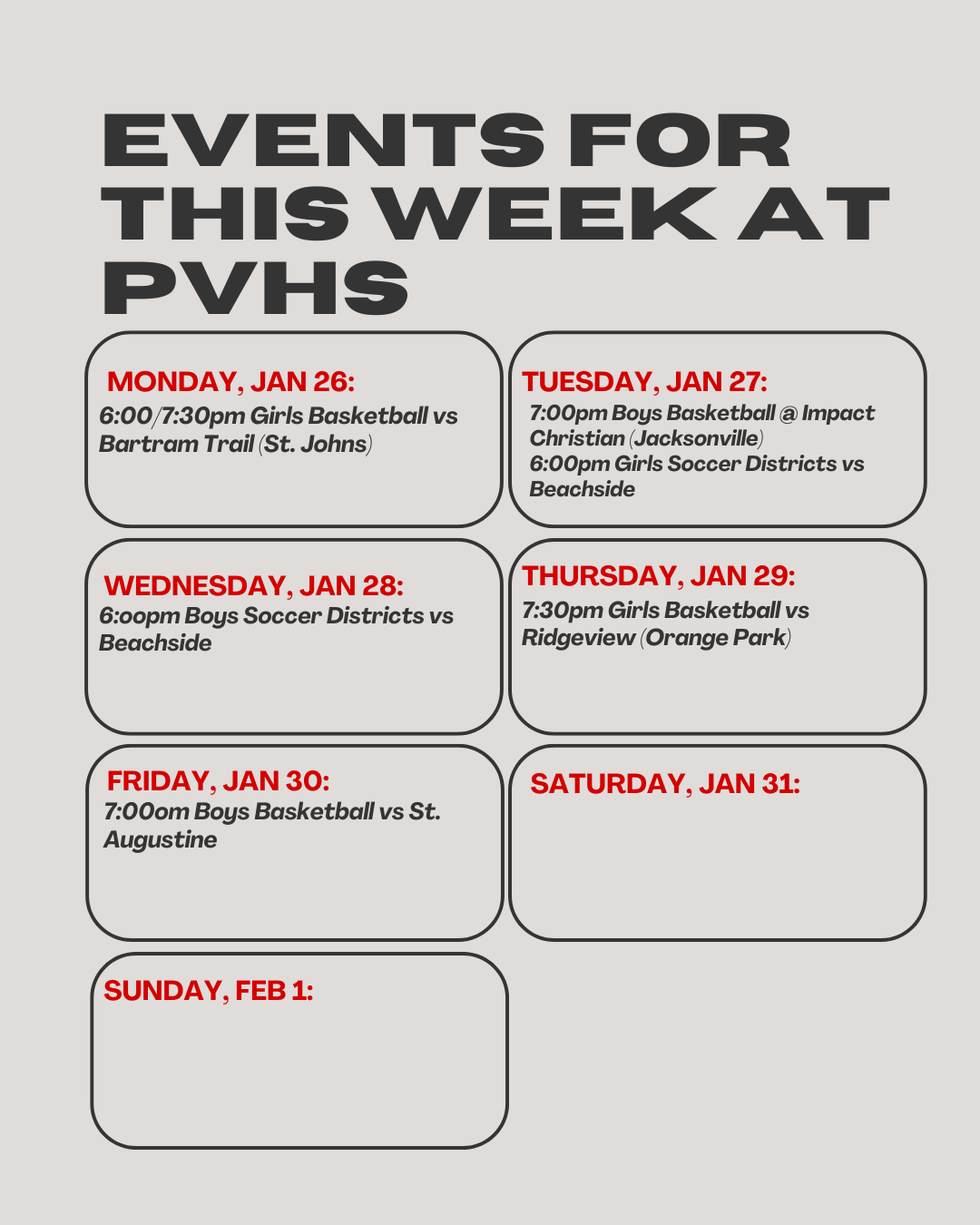 HomepageUncategorizedEvents for Week of 1/26 at Ponte Vedra High School Uncategorized Events for Week of 1/26 at Ponte Vedra High School Posted on October 21, 2025 By: Lucia Gabriel Tagged:eventspvhssharkssports LEAVE A RESPONSE Cancel replyYour email address will not be published. Required fields are marked *Comment * Name * Email * Website Save my name, email, and website in this browser for the next time I comment. Δ Post navigation Previous PostPVHS Boys Golf Start Slow, Hoping to Bounce Back Strong Next PostBoys Golf Swings to Victory Once Again You Might Also Like Uncategorized COVID Dashboard PVHS Tiburon January 13, 2021 Uncategorized This Week in History 9/13-9/20 PVHS Tiburon September 21, 2020 Uncategorized Civil rights run-down PVHS Tiburon March 5, 2021 Uncategorized This Week in History 11/23-11/30 PVHS Tiburon November 24, 2020