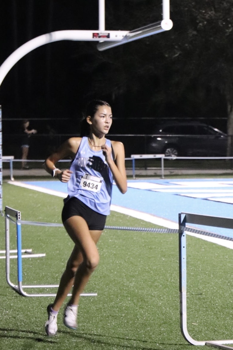 Waking up at 5 am is no big deal for sophomore Cailyn Douglas. Part of Ponte Vedra High School’s (PVHS) Track and Cross-Country teams, Douglas takes pride running seven days a week. She joined her freshman year not having substantial prior running training but quickly fell in love with the “runners high.” Though training can be demanding, running is one of her biggest passions, especially since she runs alongside an inspiring and motivational team. “It’s really fun to run with everybody,” Douglas said. And beyond the group of girls, Douglas commented that track and cross country improved her, “leadership skills and perseverance.” Douglas enjoys running the 1,600, which is a one-mile run. She claims that even though running feels exhausting in the moment, the feeling when she crosses the finish line makes all her workouts and training worthwhile.
